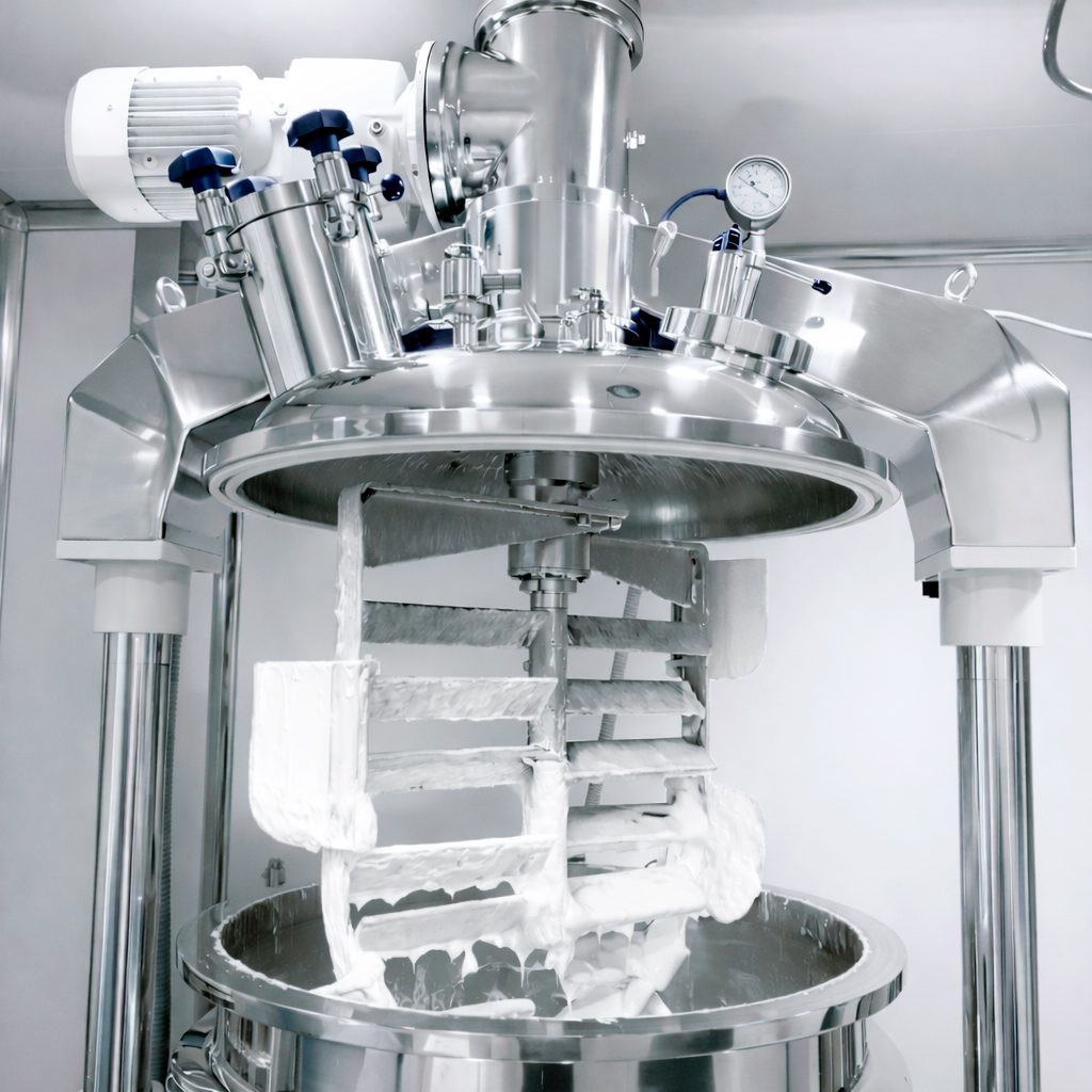 El TRI-AGI integra en un únic equip etapes crítiques del procés de fabricació de salses, cremes o pomades —prebarreja, addició, emulsió/dispersió, desairejat i control tèrmic— evitant trasvassaments i simplificant l’operació. La seva configuració amb un sistema de mescla a contrarrotació i turbina de fons afavoreix una circulació més efectiva del producte i minimitza zones mortes, millorant l’homogeneïtat del lot.
